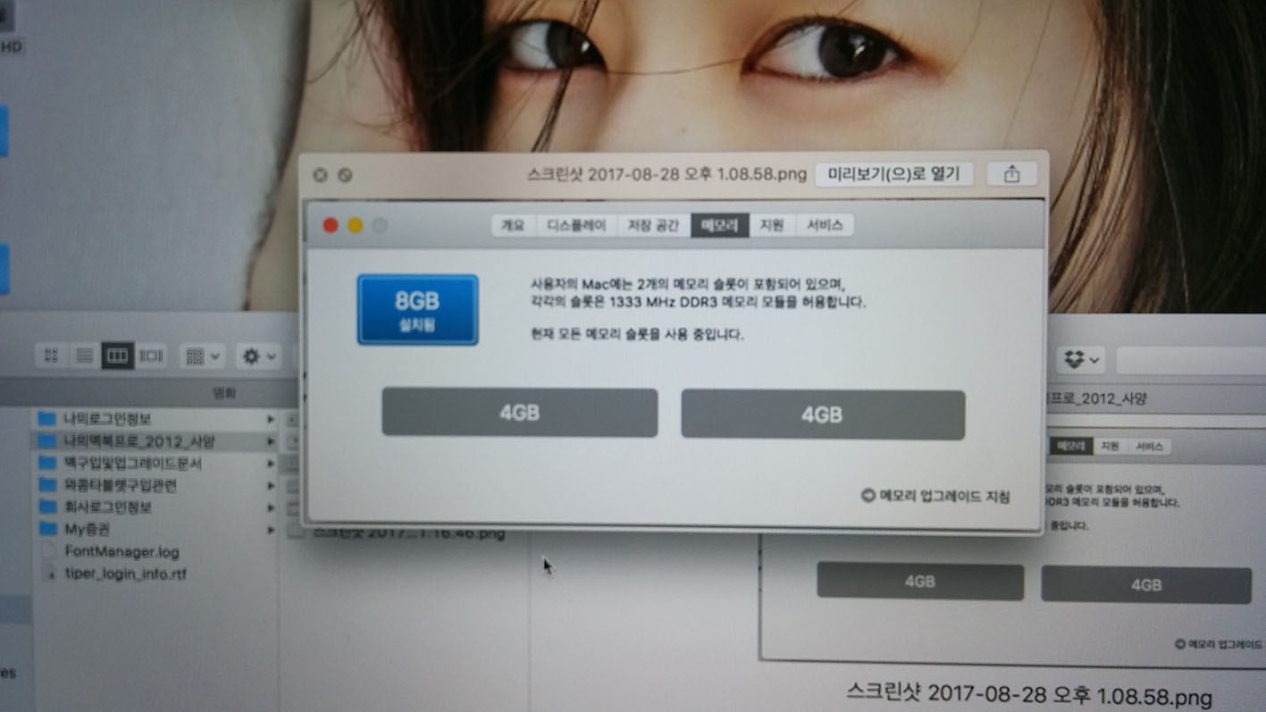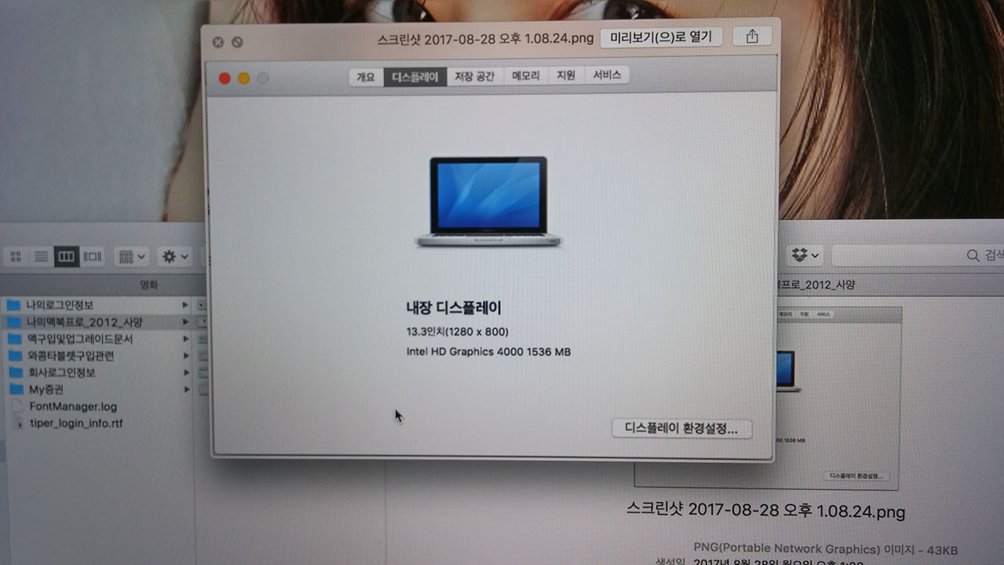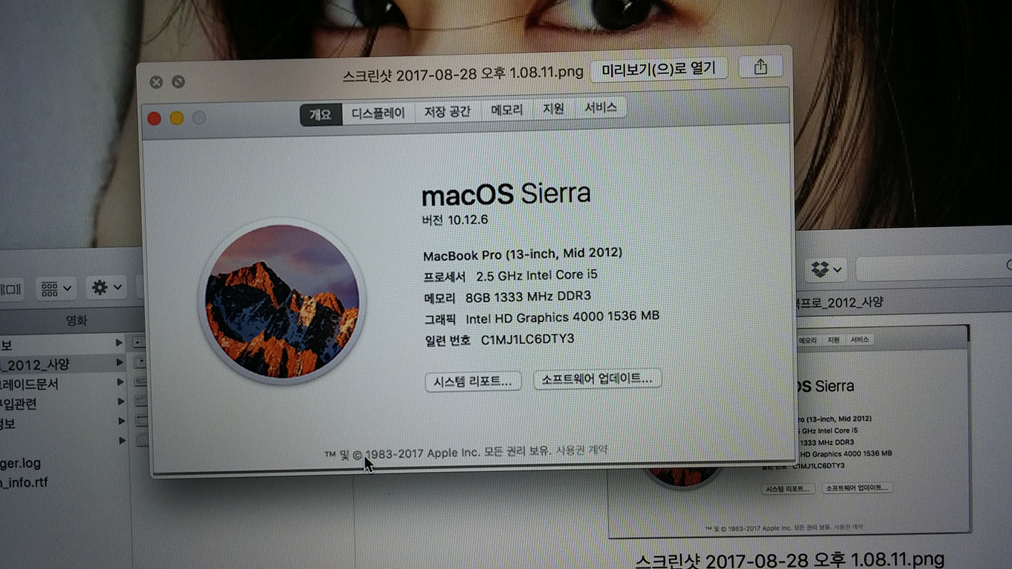 맥북프로 cpu 2.5기가, 인텔 i5, 램 8기가(업그레이드), 하드디스크 500기가