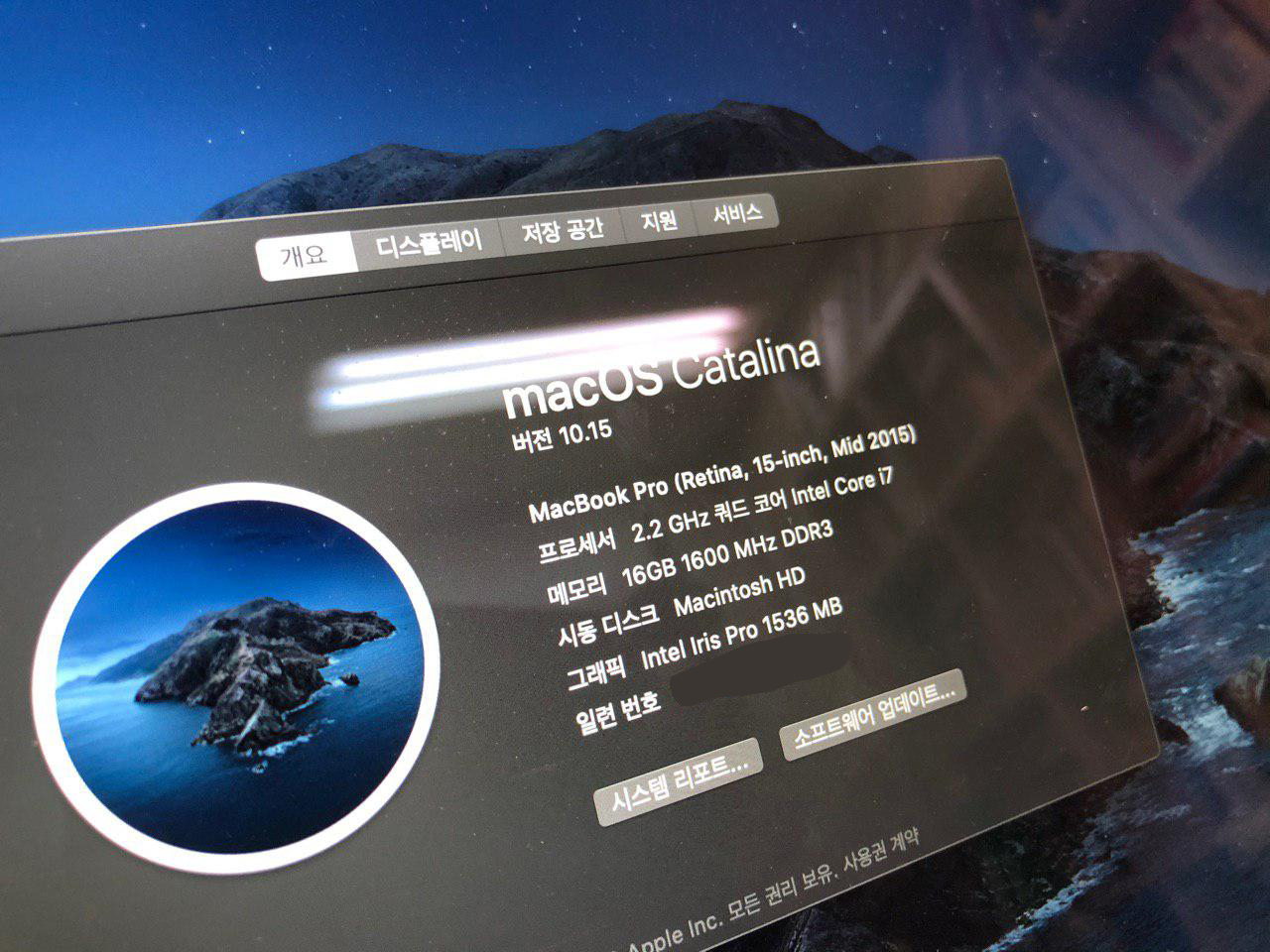 제품 사양: CPU: 2.2GHz Intel Core i7    RAM : 16GB    SSD용량 : 256GB