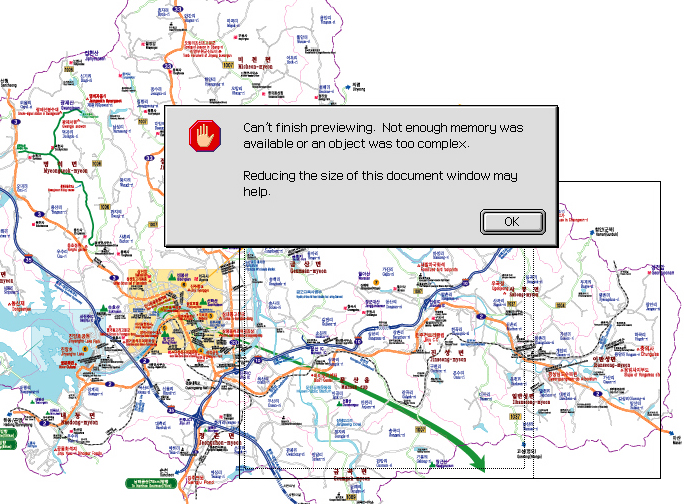 emoticon_096 지도 파일이면..상당히 파일의 크기가 클것입니다. 현재 일러스트의 사용메모리를 좀더 넉넉히 올려주세요. 방법은 일러스트프로그램 종료후.. 일러스트 실행프로그램을..정보입수(커맨드+I)후에.. 사용자 메모리를 올려주시면 됩니다. 1MB =1000 으로 계산해서 입력하세요. ========= ★준도우미 A/S의 [자기 소개]를 마우스로 눌러보세요.